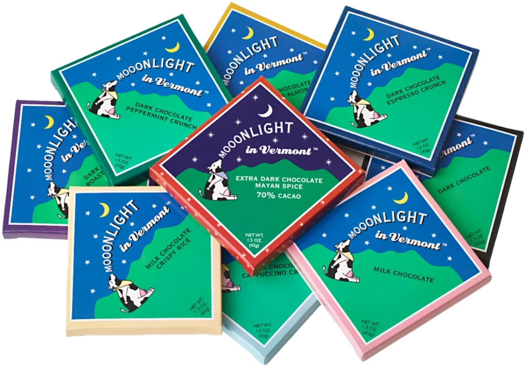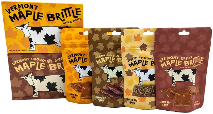 The finest chocolate confections, made by hand in small batches. Try our Vermont Maple Almond Brittle, Mooonlight in Vermont artisan chocolate bars and specialty confections. Delight friends, family and colleagues with our maple caramels, peppermint creams, turtles, bark and Peanut Butter Pigouts – be sure to treat yourself and you'll fall for Sweet On Vermont!